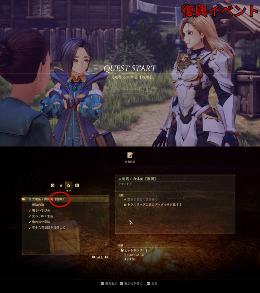 | 復興クエスト | クリアすることで街並みが変化したり、 お店に商品が追加されたりする | ・クエスト名の頭に 【復興】と記載されている |