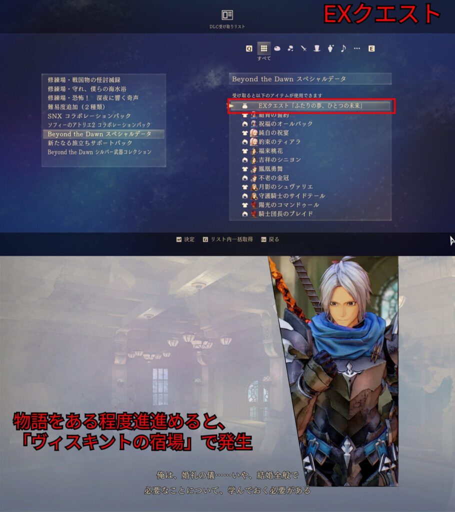 DLC受け取りリストの「Beyond the Dawn スペシャルデータ」を受け取ることでクエストの受注が可能になる。進行中は他のクエストの進行が一時止まる。