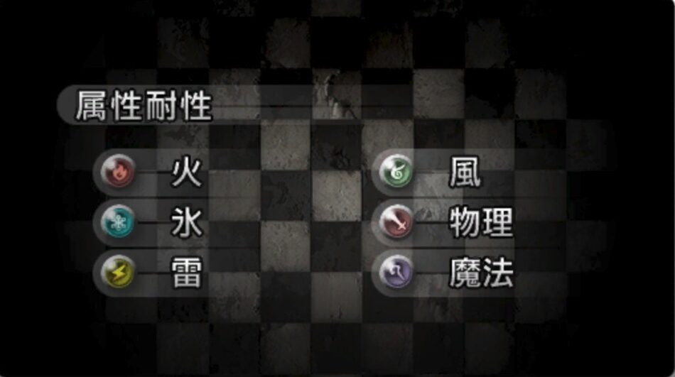 属性耐性には、強さ順に「吸収」→「無効」→「耐久」→「半減」→「標準」→ 「弱点」の序列になってるよ。