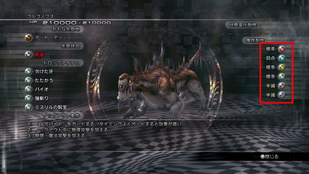 敵の属性耐性については、戦闘することで記録されるエネミーレポートに記載されていきます。強敵になるほど大切な情報なので、苦戦する場合は確認してみましょう。